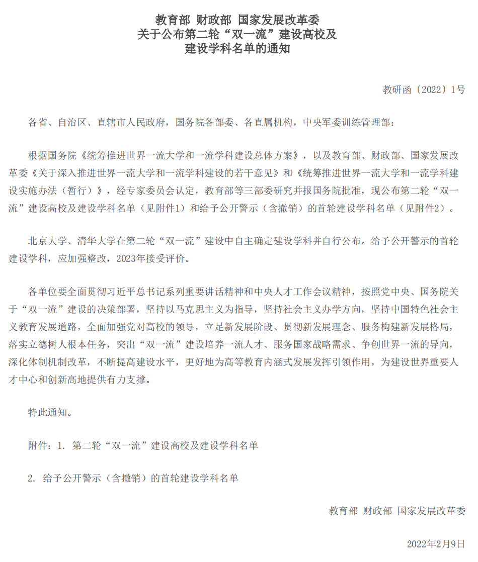 2月14日,教育部、财政部、国家发展改革委公布了第二轮“双一流”建设高校及建设学科名单。